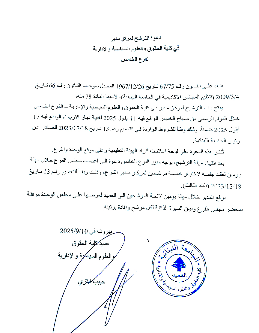تعتبر كلية الحقوق والعلوم السياسية والإدارية في الجامعة اللبنانية المصدر الأول في لبنان للكوادر القضائية والقانونية والإدارية ويغذي خريجوها القطاعات العامة والخاصة على حد سواء.